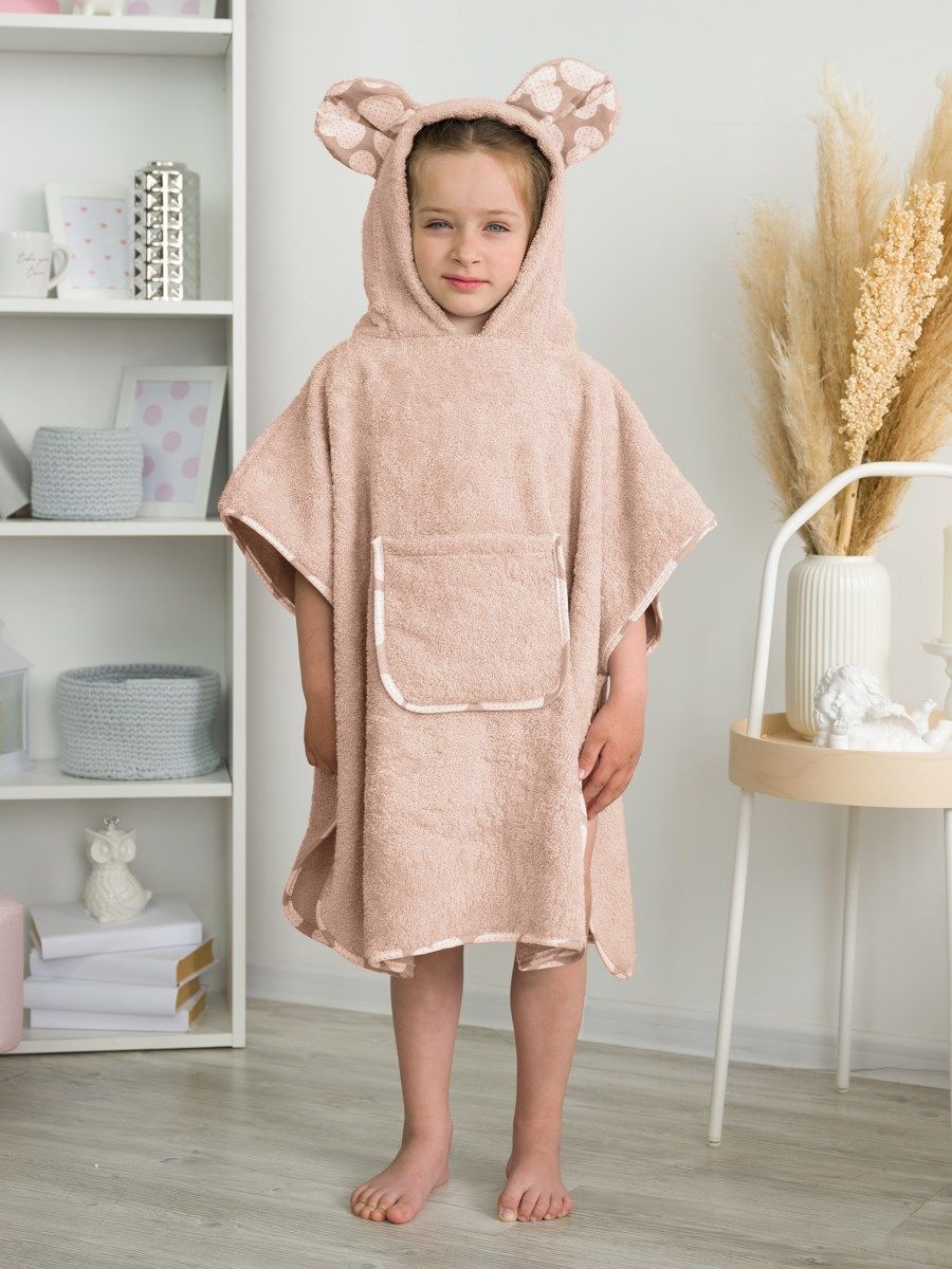Пончо для детей станет интересной альтернативой банному полотенцу или домашнему халату после купания, для посещения сауны или бассейна. Капюшон с ушами мышки, вместительный фронтальный карман и контрастная бязевая отделка делают модель максимально удобной и ещё более стильной.