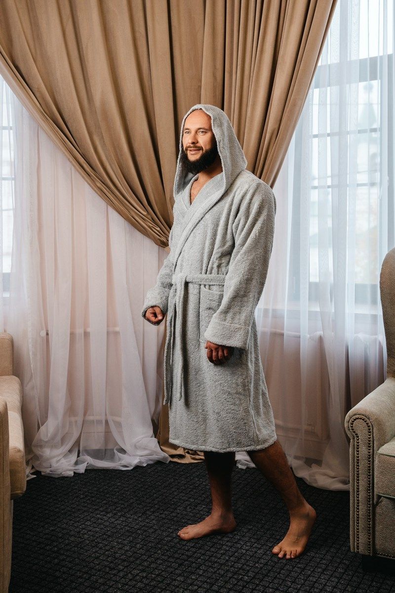 Модель халата с поясом позволяет ему быть универсальным и подходит к любому типу телосложения, скрывая недостатки и подчеркивая достоинства фигуры. Наличие карманов делает его практичным для ношения дома, в бане или сауне, а также на отдыхе.