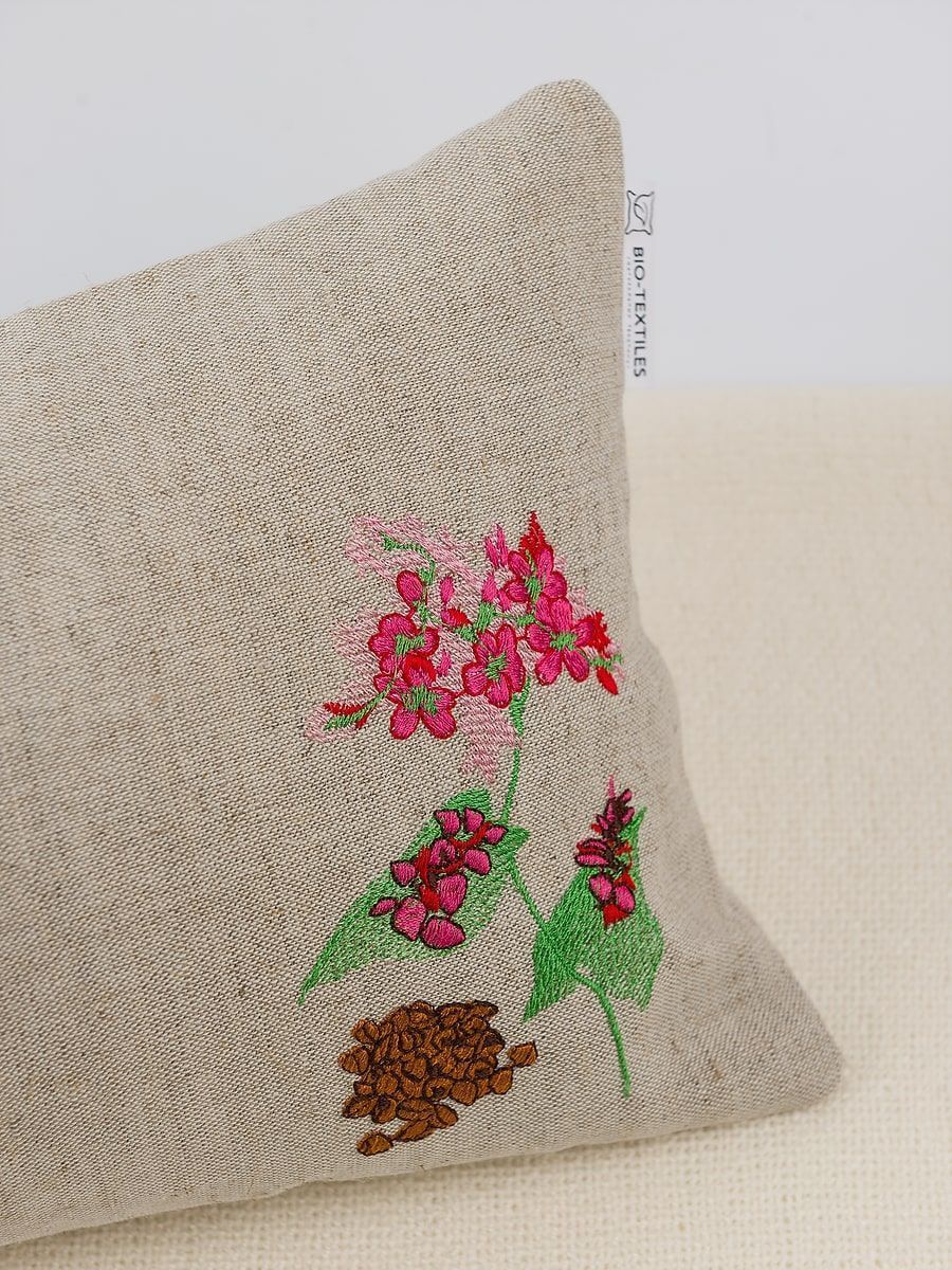 Ткань чехла – натуральный неокрашенный лён с вышивкой. Застежка-молния позволяет регулировать объем наполнителя в подушке по своему вкусу и адаптировать ее под особенности строения любого человека.