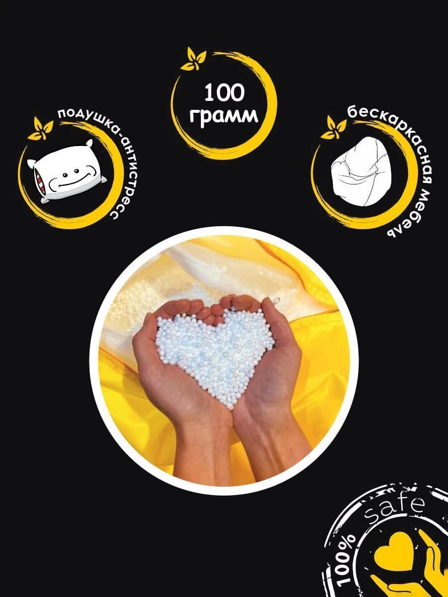 Безопасный и гипоаллергенный наполнитель в виде мелких шариков имеет суперлёгкий вес, мягкий массажный эффект, не деформируется при сдавливании и не боится влаги. Изделия с ним, такие как кресло-подушка, лёгкие и воздушные, быстро меняют форму при нажатии и выдерживают тяжелый вес.