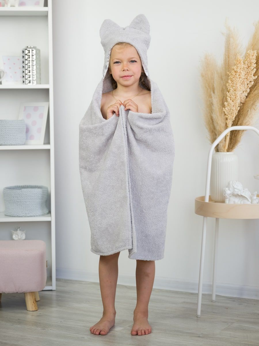 Большое полотенце с ушами кота станет незаменимым аксессуаром после купания как для новорождённых малышей, так и для подросших девочек ростом до 120 см.