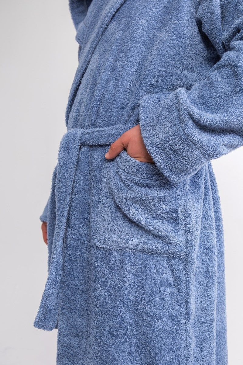 Модель халата с поясом позволяет ему быть универсальным и подходит к любому типу телосложения, скрывая недостатки и подчеркивая достоинства фигуры. Наличие карманов делает его практичным для ношения дома, в бане или сауне, а также на отдыхе.